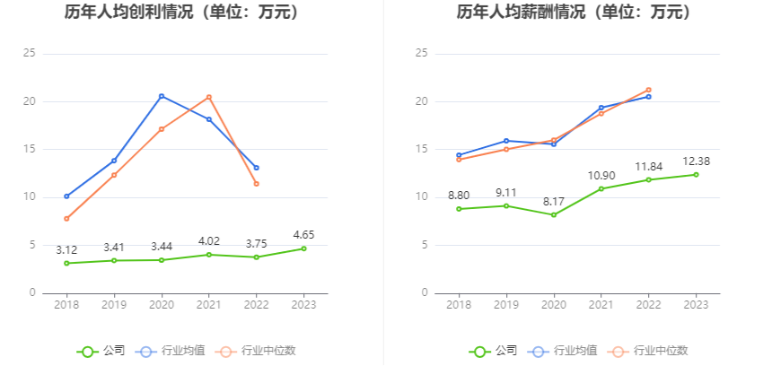 截至2023年末,公司员工总数为1693人,人均创收50.29万元,人均创利4.65万元,人均薪酬12.38万元,较上年同期分别增长8.02%、24.16%、4.50%。