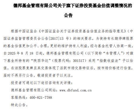 公告称,为使持有长期停牌股票的基金估值更加公平、合理,更好的维护持有人利益,经与基金托管人协商一致,自2025年8月18日起,德邦基金管理有限公司对旗下基金所持有的“陕西华达”(股票代码:301517)采用“指数收益法”予以估值。在该股票复牌且其交易体现了活跃市场交易特征后,按市场价格进行估值,届时不再另行公告。敬请投资者予以关注。