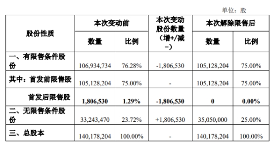 本次解除限售前,长华化学总股本140,178,204股,其中有限售条件股份106,934,734股,无限售条件股份33,243,470股。本次解除限售后,长华化学总股本140,178,204股,其中有限售条件股份105,128,204股。无限售条件股份35,050,000股。