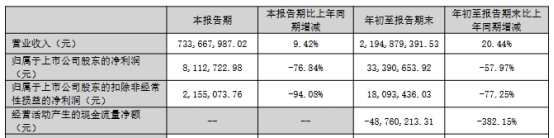 今年前三季度,长华化学营业收入21.95亿元,同比增长20.44%;归属于上市公司股东的净利润3339.07万元,同比下降57.97%;归属于上市公司股东的扣除非经常性损益的净利润1809.34万元,同比下降77.25%;经营活动产生的现金流量净额-4876.02万元,同比下降382.15%。