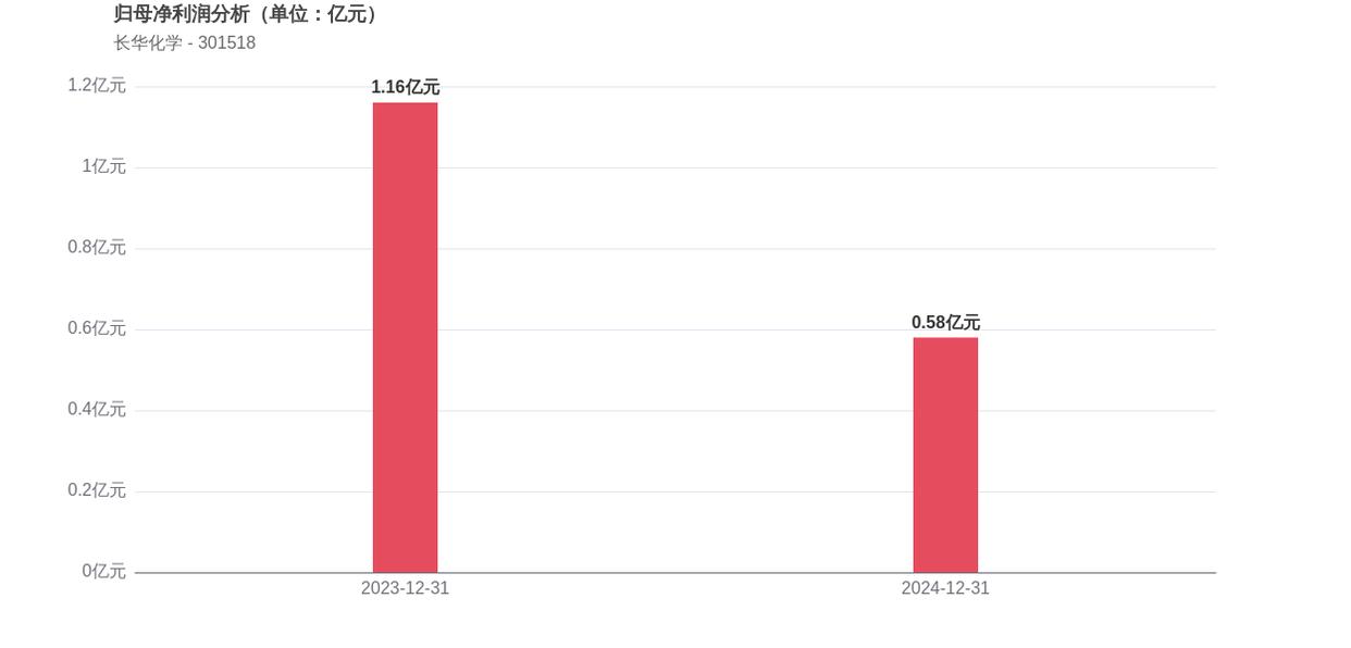 长华化学上市的2023年,当年实现归母净利润1.16亿元。截至最新完整财年的2024年,公司实现0.58亿元的归母净利润,近年累计下降了49.90%。这2年间,长华化学无一年份出现亏损。
