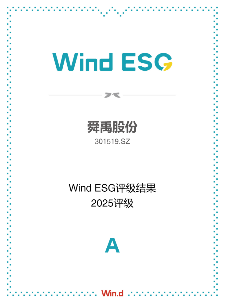近日,根据万得(Wind)最新ESG评级显示:舜禹股份Wind ESG评级由BB连升两级至A。充分展现了公司在可持续发展道路上的卓越表现,也是舜禹股份在可持续发展领域的重要突破。