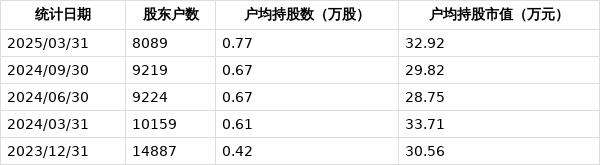 从4月19日公开信息显示,多浦乐截至2025年3月31日公司股东户数为8089户,较上期(2024年9月30日)减少160户,降幅为1.94%,变化不大。