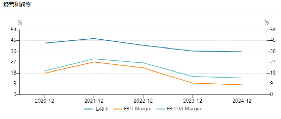 趋势。2024 年毛利率为 35.79%,同比下降 1.83%,到了 2025 年一季度,毛利率进一步降至 33.29%,较去年同期减少了 8.57 个百分点。毛利率下滑的背后,一方面是市场竞争导致产品价格下降,另一方面则是原材料成本、研发成本等不断上升。