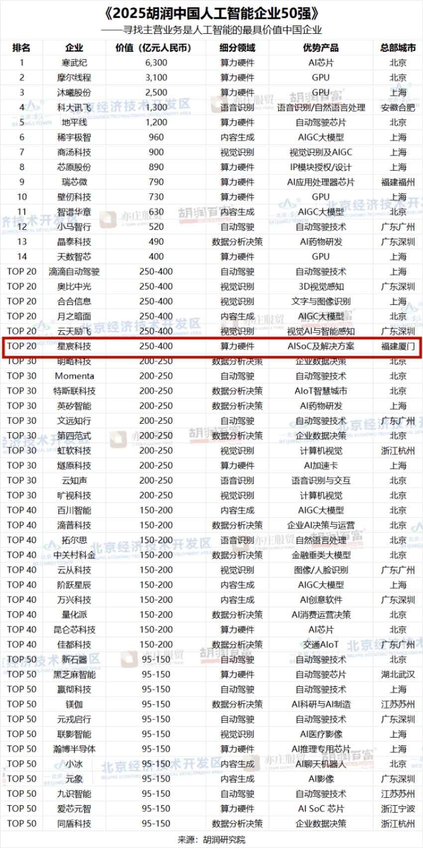 2026年1月19日,胡润研究院发布《2025胡润中国人工智能企业50强》榜单,星宸科技凭借在端边侧AI芯片及智慧视觉领域的持续创新与规模落地,位列榜单前20强。这是胡润研究院第二次聚焦“主营业务为AI算力或算法”的中国企业进行价值排名,星宸科技的上榜标志着其正式跻身中国人工智能最具价值企业第一梯队。