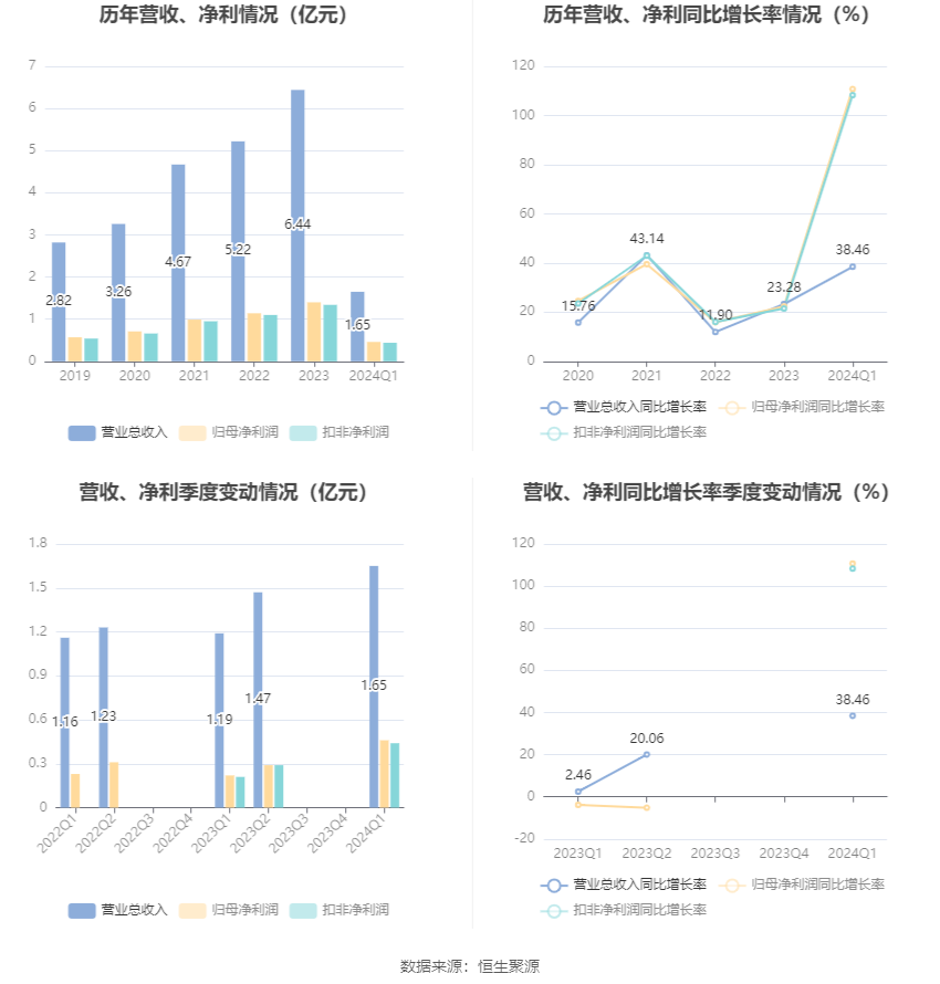 2024年一季度,公司毛利率为49.36%,同比上升5.05个百分点;净利率为27.65%,较上年同期上升9.49个百分点。