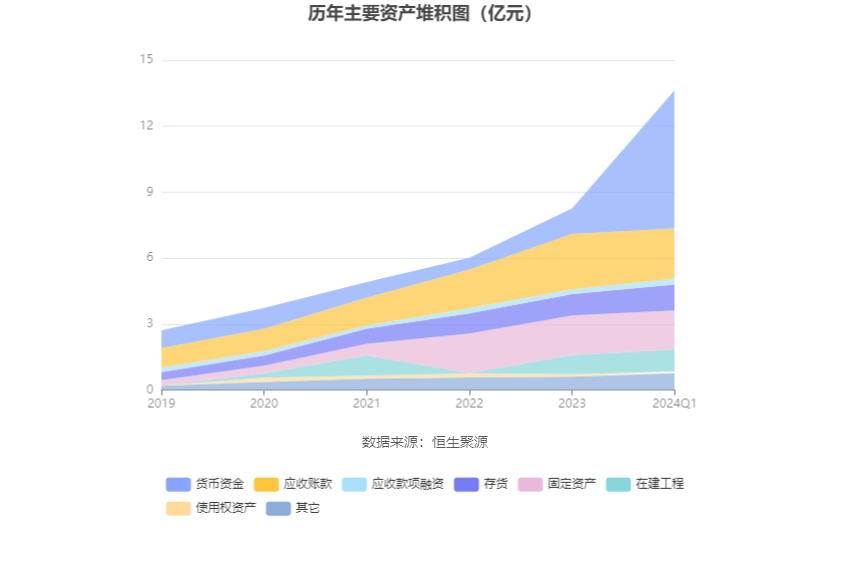 资产重大变化方面,截至2024年一季度末,公司货币资金较上年末增加443.13%,占公司总资产比重上升32.03个百分点;应收账款较上年末减少9.29%,占公司总资产比重下降13.85个百分点;固定资产较上年末减少1.23%,占公司总资产比重下降8.82个百分点;在建工程较上年末增加15.29%,占公司总资产比重下降3.19个百分点。