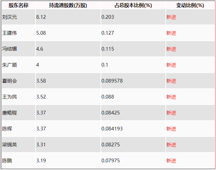 一季报显示,2024年一季度末的公司十大流通股东中,新进股东为刘汉元、王建伟、冯结镅、朱广顺、夏明会、王为民、唐略程、陈辉、梁锦英、陈鹏。