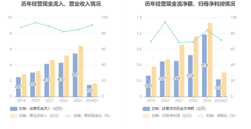 2024年第一季度,公司营业收入现金比为90.79%,净现比为71.84%。