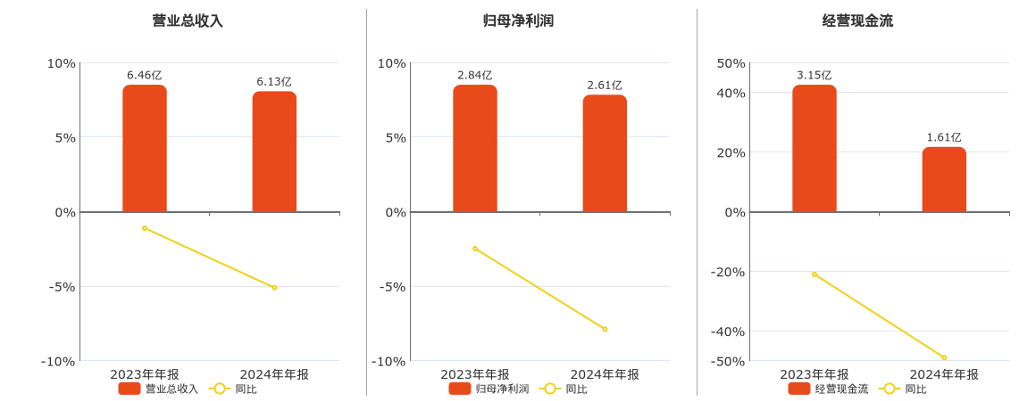 公司营业总收入为6.13亿元,较去年同报告期营业总收入减少3302.98万元,同比较去年同期下降5.11%。归母净利润为2.61亿元,较去年同报告期归母净利润减少2240.67万元,同比较去年同期下降7.89%。经营活动现金净流入为1.61亿元,较去年同报告期经营活动现金净流入减少1.54亿元,同比较去年同期下降49.03%。
