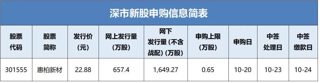 2023年10月20日,惠柏新材料科技(上海)股份有限公司(简称:惠柏新材)将通过深交所网下发行电子平台和交易系统发行新股,具体信息如下。