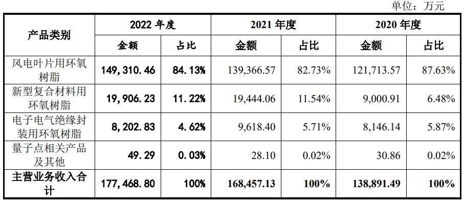 招股书披露,惠柏新材主营业务为特种配方改性环氧树脂系列产品的研发、生产和销售,主要包括风电叶片用环氧树脂、新型复合材料用环氧树脂、电子电气绝缘封装用环氧树脂等多个应用系列产品。此外,公司还少量销售用于Mini\Micro
