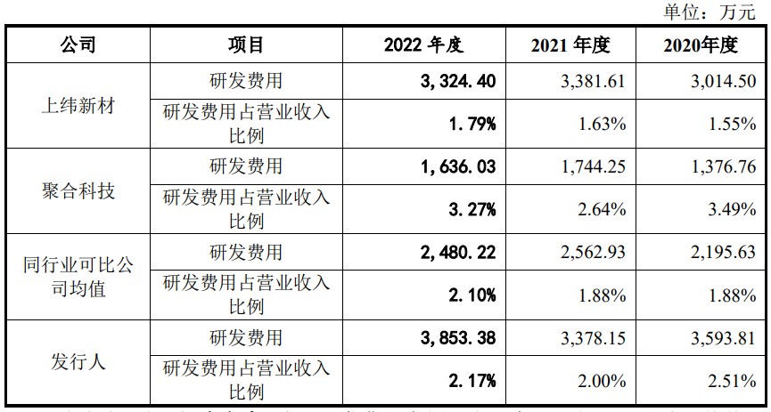 报告期内,公司研发费用金额及占比高于同行业可比公司均值。2020年度、2021年度、2022年度,公司研发费用合计金额约为1.08亿元。公司研发费用投入占营业收入比例情况如下: