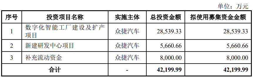 众捷汽车本次发行募集资金总额为50,160.00万元,扣除发行费用后募集资金净额为42,316.09万元,公司募集资金净额比原计划多116.10万元。众捷汽车2025年4月21日披露的招股书显示,公司拟募集资金42,199.99万元,用于数字化智能工厂建设及扩产项目、新建研发中心项目、补充流动资金。