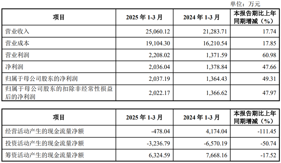 2025年1-3月,公司营业收入25,060.12万元,同比增长17.74%;净利润2,036.04万元,同比增长47.66%;归属于母公司股东的净利润2,037.19万元,同比增长49.31%;归属于母公司股东的扣除非经常性损益后的净利润2,022.17万元,同比增长47.97%;经营活动产生的现金流量净额-478.04万元,上年同期为4,174.04万元。