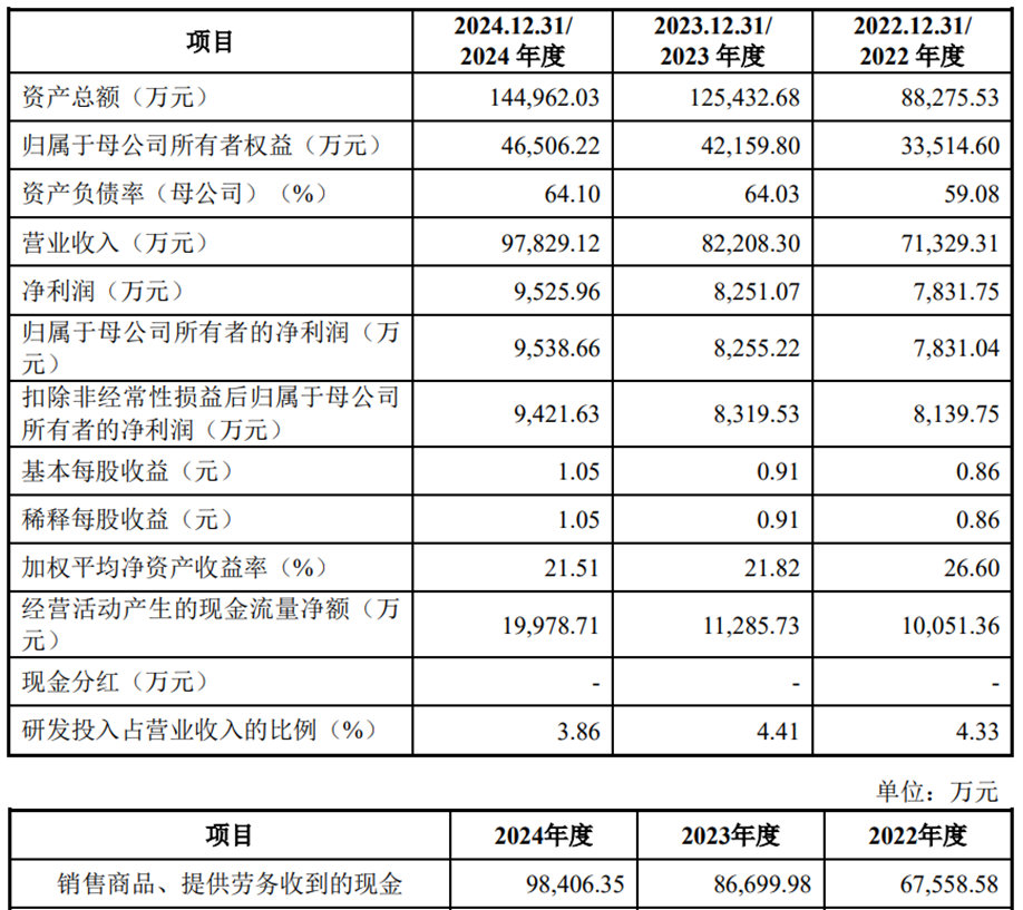 2022年至2024年,众捷汽车的营业收入分别为71,329.31万元、82,208.30万元和97,829.12万元;净利润分别为7,831.75万元、8,251.07万元和9,525.96万元;归属于母公司所有者的净利润分别为7,831.04万元、8,255.22万元和9,538.66万元;扣除非经常性损益后归属于母公司所有者的净利润分别为8,139.75万元、8,319.53万元和9,421.63万元。