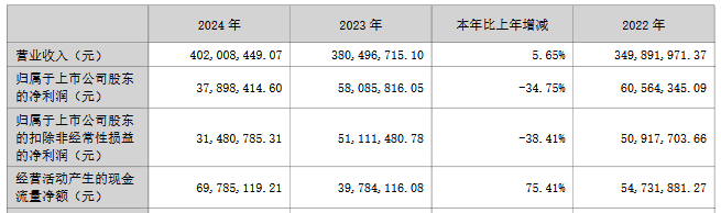 2022年至2024年,公司营业收入分别为3.50亿元、3.80亿元、4.02亿元,归属于上市公司股东的净利润分别为6,056.43万元、5,808.58万元、3,789.84万元,归属于上市公司股东的扣除非经常性损益的净利润分别为5,091.77万元、5,111.15万元、3,148.08万元,经营活动产生的现金流量净额分别为5,473.19万元、3,978.41万元、6,978.51万元。
