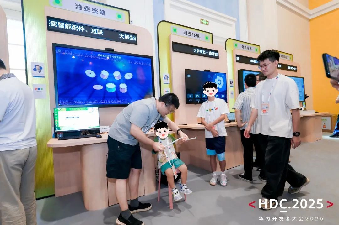 现场展示的UWB空气架子鼓,运用超宽带(UWB)技术,能够实现亚厘米级定位精度,以每秒 1000 次的高频采样速率,精准捕捉每一次敲击动作,响应延迟低至 15ms ,几乎达到“手起声落”的即时反馈效果。用户无需真实鼓具,只需挥动特制鼓棒,就能在客厅空间内完成演奏。配合开源鸿蒙 TV 的高画质渲染与 3D 环绕音效,可瞬间将客厅转化为沉浸式音乐舞台。
