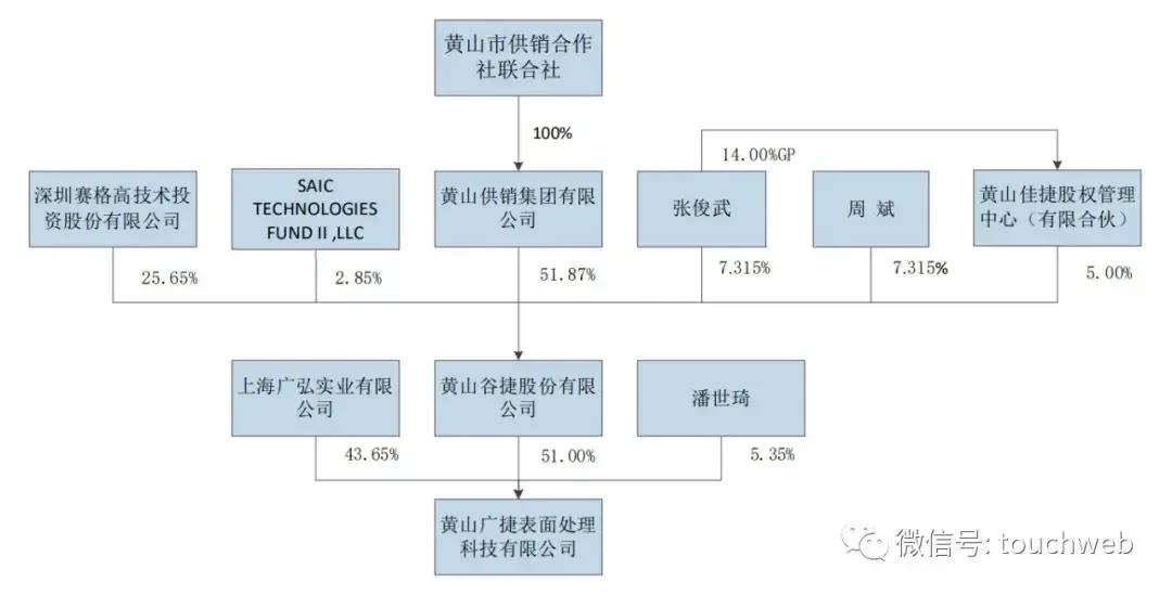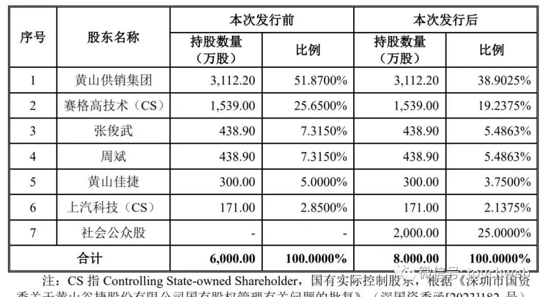 IPO后,黄山供销集团持股为38.9025%,赛格高技术(CS)持股为19.2375%,张俊武、周斌分别持股为5.4863%,黄山佳捷持股为3.75%,上汽科技(CS)持股为2.1375%。