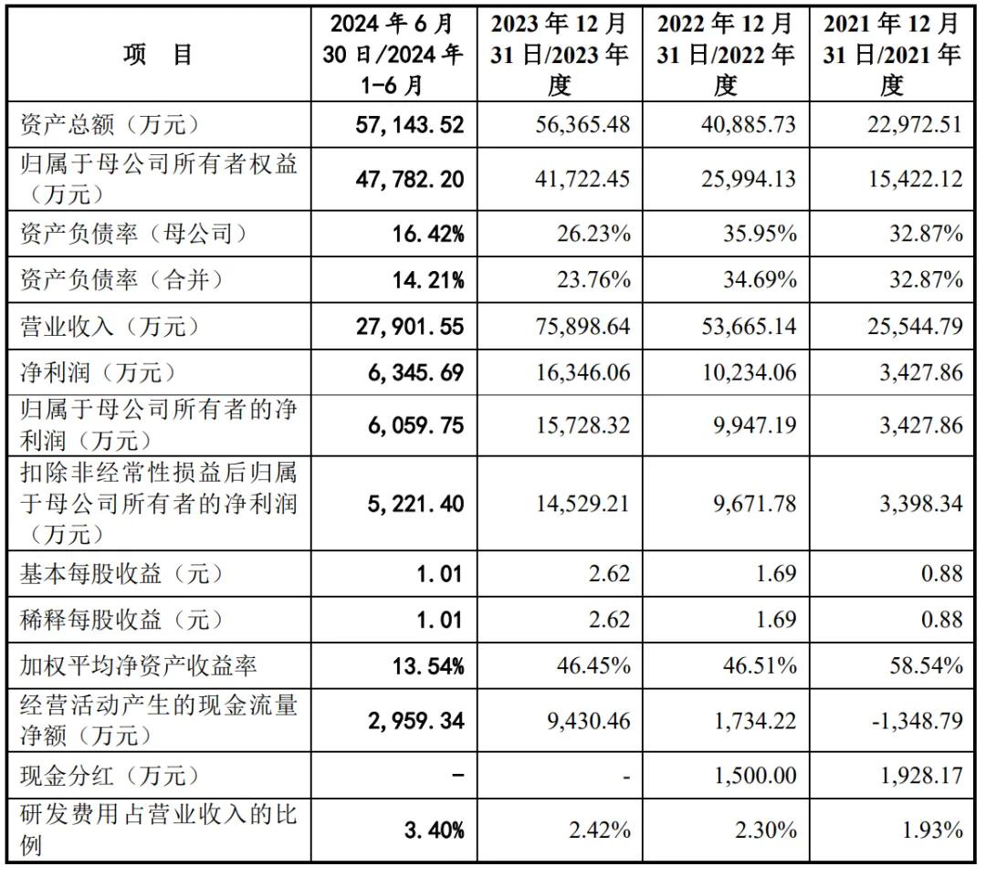 招股书显示,黄山谷捷2021年、2022年、2023年营收分别为2.55亿元、5.37亿元、7.59亿元;净利分别为3427.86万、1亿、1.63亿;扣非后净利分别为3398万元、9671.78万元、1.45亿元。
