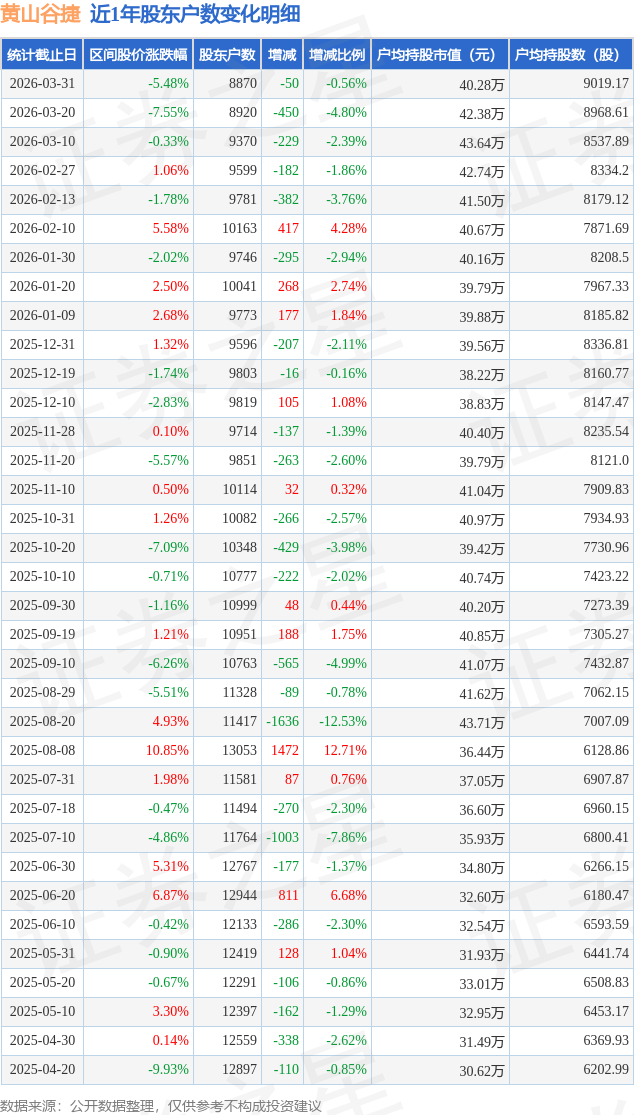 从股价来看,2026年3月20日至2026年3月31日,黄山谷捷区间跌幅为5.48%,在此期间股东户数减少50.0户,减幅为0.56%。