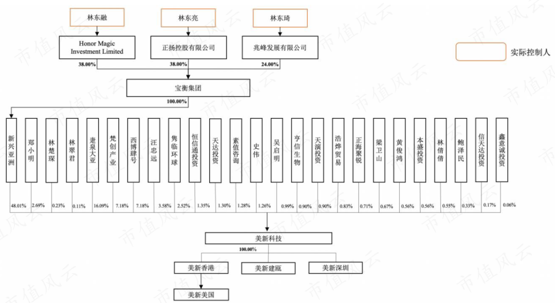 截至招股书签署日,美新科技的实控人仍为林东融、林东亮和林东琦,连同郑小明(实控人妹夫)、林楚琛(林东融之子)、林翠君(林东亮之女)等一致行动人,合计控制公司51%股份。