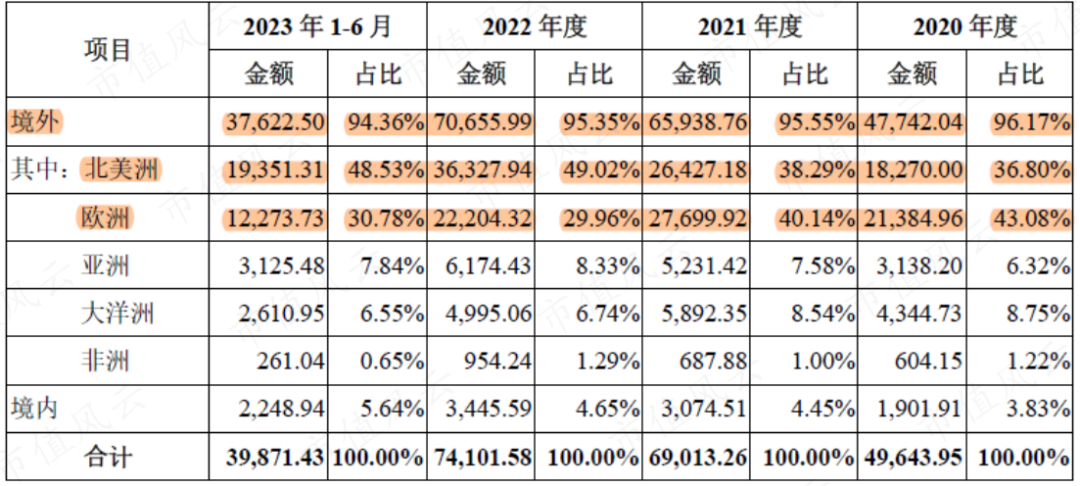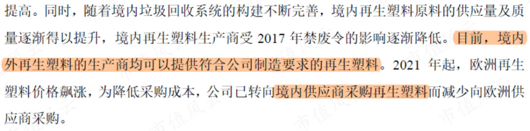 对于生产所需的再生塑料,美新科技在2021年之后,也逐渐转向境内采购。另一方面,其销售主要是面向境外市场,2020年以来的占比超九成。
