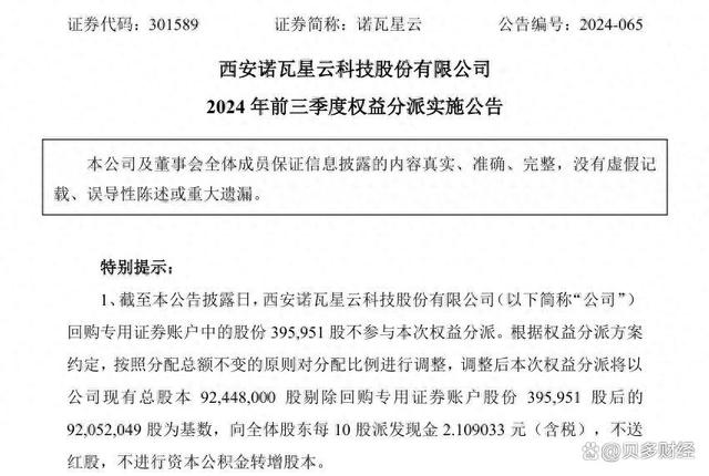 近日,西安诺瓦星云科技股份有限公司(301589.SZ,下称“诺瓦星云”)发布2024年前三季度权益分配实施公告。诺瓦星云将以总股本9205.20万股为基数,向全体股东每10股派发现金红利2.11元,合计派发现金红利1941.41万元。