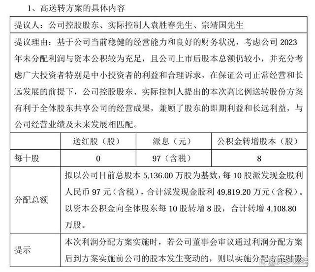 在披露2023年财报的同时,诺瓦星云计划向全体股东每10股派发现金股利97元(含税),合计派发现金股利4.98亿元(含税),同时以资本公积金向全体股东每10股转增8股,合计转增4108.8万股。