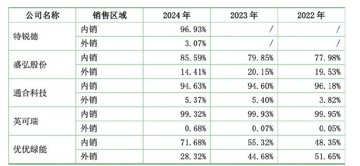 对此,优优绿能解释称,报告期内公司毛利率高于同行业可比公司平均值的主要原因是公司外销收入增长迅速,占比高于同行业可比公司,且外销业务的毛利率较高。公司营业收入与同行业可比公司内外销收入占比情况如下: