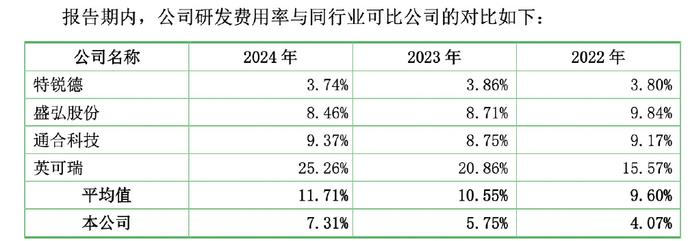 同一时间段,同行业可比公司特锐德、盛弘股份、通合科技、英可瑞的研发费用率均值分别为9.60%、10.55%、11.71%。