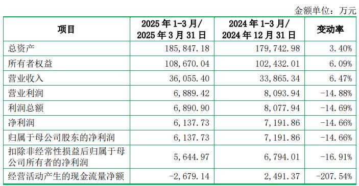 2025年1-3月,优优绿能营业收入为36,055.40万元,同比增长6.47%;净利润6,137.73万元,同比减少14.66%;归属于母公司股东的净利润6,137.73万元,同比减少14.66%;扣除非经常性损益后归属于母公司所有者的净利润5,644.97万元,同比减少16.91%;经营活动产生的现金流量净额-2,679.14万元,上年同期2,491.37万元。