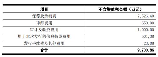 优优绿能本次发行费用总额(不含税)为9,700.86万元,其中保荐及承销费7,526.40万元。