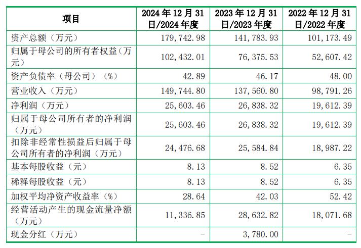 2022年、2023年、2024年,优优绿能营业收入分别为98,791.26万元、137,560.80万元、149,744.80万元;净利润分别为19,612.39万元、26,838.32万元、25,603.46万元;归属于母公司所有者的净利润分别为19,612.39万元、26,838.32万元、25,603.46万元;扣除非经常性损益后归属于母公司所有者的净利润分别为18,987.22万元、25,584.84万元、24,476.68万元。