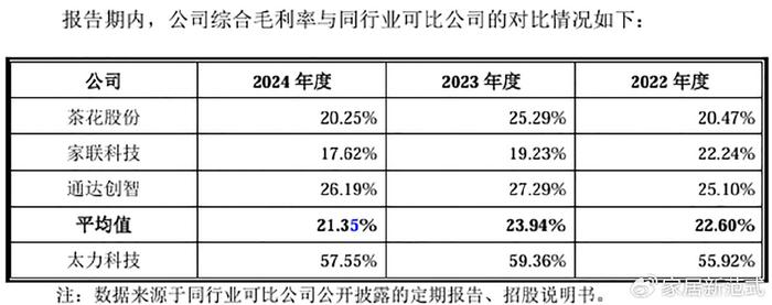 另一方面,通过线上直销模式,太力科技减少经销商等中间环节,毛利率大幅高于同行。2024年,其毛利率为57.05%,高于同行业可比公司的毛利率平均值21.35%。但是,这种模式也导致期间费用高企。