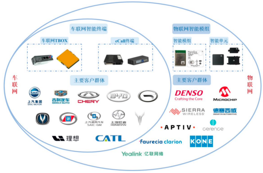 其中在车联网领域,公司专注汽车电子电气架构升级以及汽车产业数字化转型,是国内最早推出车联网解决方案的企业之一,公司为上汽集团、奇瑞汽车、吉利汽车、比亚迪、长城汽车、广汽集团、理想汽车、蔚来汽车、宁德时代、德赛西威、电装天、安波福等自主品牌整车厂商提供车联网智能终端、物联网智能模组和解决方案,目前为上述客户的一级供应商。同时,公司的智能模组还搭载在大众汽车、丰田汽车、通用汽车、长城汽车等品牌车型上。
