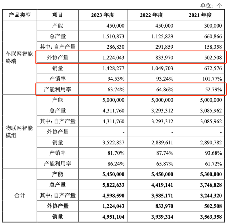 同时,公司虽自称有多年的业务积累,但根据公司此前招股书披露数据中显示,公司2021-2023年车联网智能终端外协产量分别为50.25万个、83.4万个、122.4万个,远高于自产产量的15.84万个、29.19万个、28.68万个,外协比例非常高,自身产能利用率仅分别为52.79%、64.86%、63.74%。