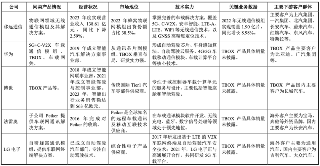 目前,国外竞争对手博世、法雷奥等国际厂商成立时间早、技术积累深厚,在技术研发、资金体量、客户资源等方面都基本拥有碾压优势。国内市场中,整车厂一般通过自研生产、对外采购或自研生产和对外采购相结合方式,获得配套的车联网智能终端,像德赛西威、移远通信、华为等大体量的巨头,也正在不断加码,这些竞争对手背靠整车制造厂商,还具备为相应整车厂提供产品和服务的机会和能力。
