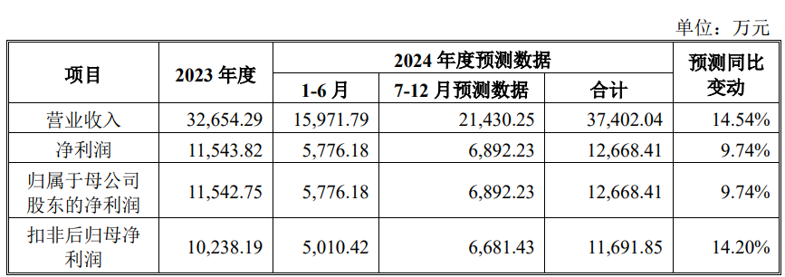 2024年度公司预测实现营业收入为37,402.04万元,同比增长14.54%;净利润/归属于母公司的净利润为12,668.41万元,同比增长9.74%;扣非后归母净利润为11,691.85万元,同比增长14.20%。