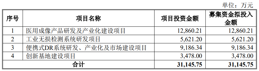 超研股份本次发行募集资金总额为43,047.13万元,扣除发行费用后募集资金净额38,436.32万元,公司募集资金净额比原计划多7,290.57万元。超研股份2025年1月17日披露的招股书显示,公司拟募资31,145.75万元,用于“医用成像产品研发及产业化建设项目”“工业无损检测系统研发项目”“便携式DR系统研发、产业化及市场建设项目”“创新基地建设项目”。