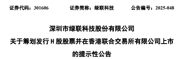 来自广东深圳的A股上市公司绿联科技(301606.SZ)发布公告称,为深化公司的全球化战略布局,提升公司国际化品牌形象,并进一步提升公司核心竞争力,经充分研究论证,公司拟发行境外上市股份(H股)并申请在港交所主板上市。
