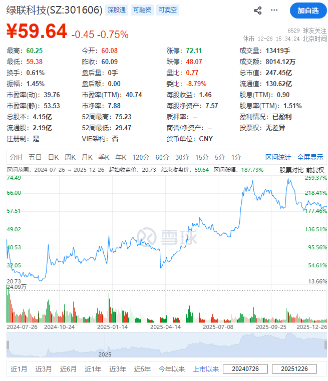 绿联科技(301606.SZ)于2024年7月26日在深交所上市,截至周五(12月26日)收市,其总市值约247.45亿元人民币。