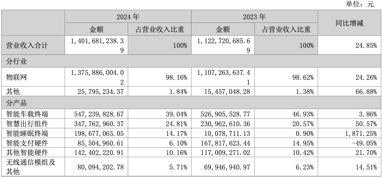 公告资料显示,公司依托“通信+定位+AI”底层核心技术与“模组+终端”业务模式,深耕车联网,广泛布局物联网,持续强化“中国供应链基座+全球价值网络”的出海模式,使得公司智能车载终端、智能睡眠终端在海外市场拓展颇见成效,同时得益于部分重点客户的供应份额提升,公司智能车载终端、智能出行组件、智能睡眠终端、其他智能硬件、无线通信模组及其他业务,分别同比增长3.86%、50.57%、1871.25%、21.7%、14.51%至5.47亿元、3.48亿元、1.99亿元、1.42亿元、0.8亿元,近乎全面增长。单看2024年海外收入3.27亿元,则呈现同比增长399.37%的爆发式增长。