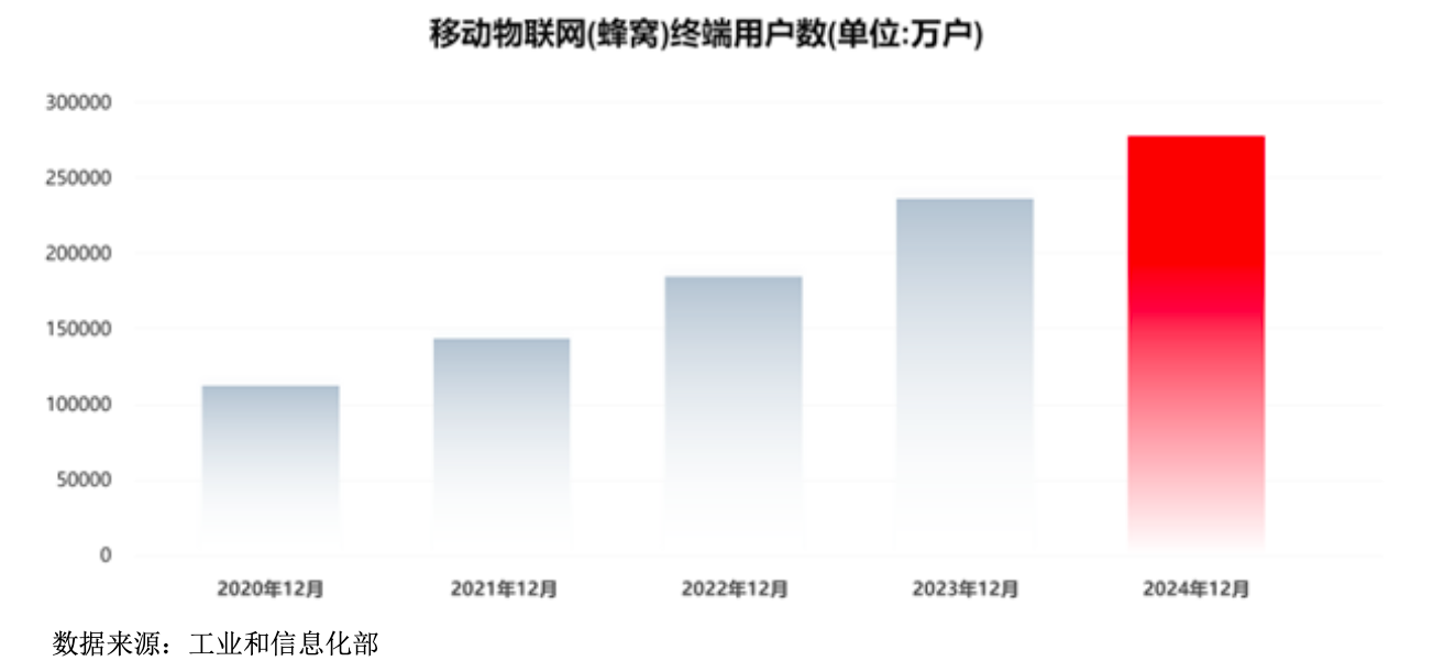 以DeepSeek为代表的AI技术进步,为物联网行业注入了新的活力。随着模型能力的逐步提升,应用需求扩张推动AI硬件需求同步扩容,进一步推动了物联网行业的发展。根据工业和信息化部的数据,截至2024年12月底,我国移动物联网(蜂窝)终端用户数为26.56亿户,同比增长13.88%。根据《世界万物智联数字经济白皮书》,中国在物联网基础建设、数字经济创新发展方面走在了世界第一,物联网连接数有望突破30亿。