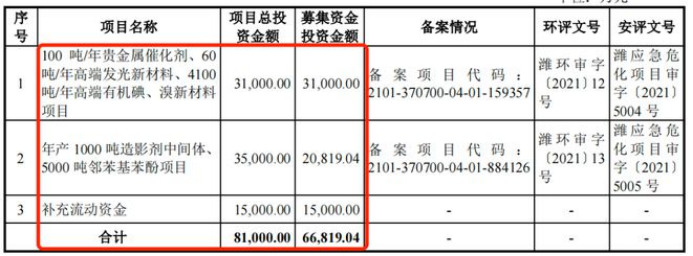 除了业绩的高增长让人倍感担心之外,该公司募资投向的必要性同样也是让市场感到疑虑的。招股书显示,博苑股份本次拟募集资金6.68亿元,其中3.1亿元投向100吨/年贵金属催化剂、60吨/年高端发光新材料、4100吨/年高端有机碘、溴新材料项目;2.08亿元投向年产1000吨造影剂中间体、5000吨邻苯基苯酚项目;1.5亿元用于补充流动资金。