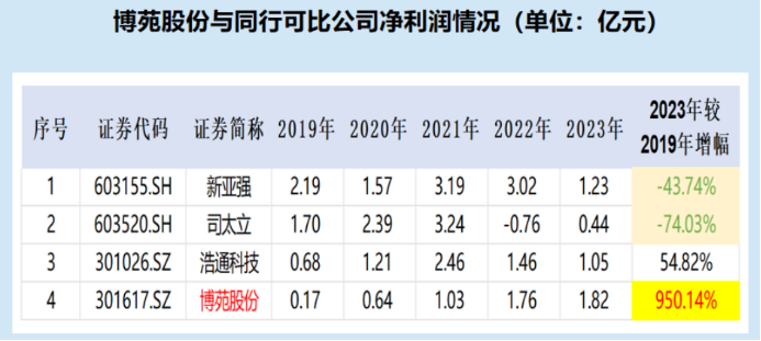 与同行可比公司相比,博苑股份的业绩增速显著高于同行均值,尤其是净利润增速更是远超同行。招股书中,博苑股份将新亚强、司太立、浩通科技作为可比上市公司,三家公司2023年的净利润较2019年的增幅分别为-43.74%、-74.03%、54.82%,远远低于博苑股份的950%增幅。