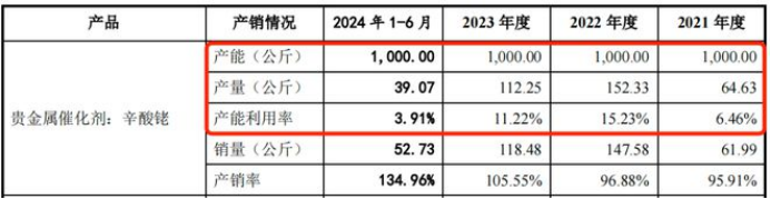 从募资用途来看,博苑股份的募资主要投向于主营业务扩充,但这种投向的必要性令人怀疑,因为该公司的产能利用率本来就很低。招股书显示,博苑股份贵金属催化剂为辛酸铑,现有产能1000公斤,2021年-2023年产能利用率分别为6.46%、15.23%和11.22%,到2024年上半年产能利用率仅为3.91%,产量仅有39.07公斤。在产能利用率如此低下的情况下,博苑股份仍计划新增年产100吨的贵金属催化剂产能,这样的募资投向是否合适?