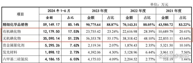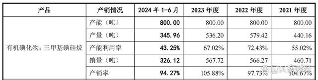但是,该举措也可能引发产能过剩的风险,比如,有机碘化物的主要产品是三甲基碘硅烷,报告期内,该产品产能利用率分别为55.02%、72.43%、67.02%和43.25%,可见,自2022年开始该产品的产能利用率便逐年下降。