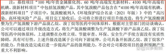 正如我们前文所提及的博苑股份此次募资扩张产能计划,其中有不少产品就属于“高污染、高环境风险”之列,如“100 吨/年贵金属催化剂、60 吨/年高端发光新材料、4100 吨/年高端有机碘、溴新材料项目”中所包含的氢溴酸产品。