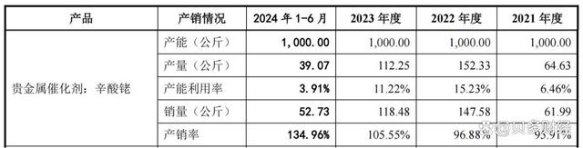 先来看几组数据。以此次扩充产能的贵金属催化剂项目为例,该产品主要是辛酸铑,公司现有产能可达1000公斤,2021年-2023年产能利用率分别为6.46%、15.23%和11.22%,而到了2024年上半年,其产能利用率却仅为3.91%,产量仅有39.07公斤。